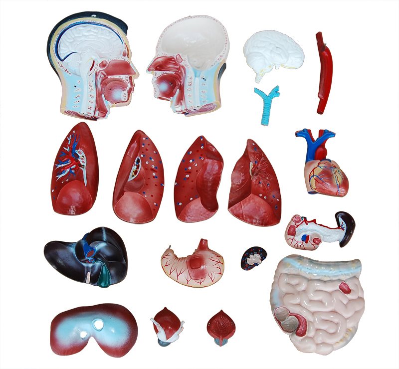 This is a full-size male torso. Hand painted and meticulously assembled to simulate human anatomy. Dissects into 19 parts: torso, head (2 parts), brain, lung (4 parts), heart, trachea, esophagus and descending aorta, diaphragm, stomach, duodenum with pancreas and spleen, intestines, kidney, liver and bladder (2 parts). Mounted on plastic base.
