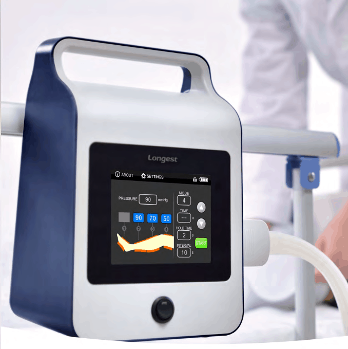 The LGT-2201DVT Compression Therapy System is an advanced pressotherapy system designed to reduce the risk of Deep Venous Thrombosis (DVT) and Pulmonary Embolism (PE) before, during, and after surgery. With its professional overlapping DVT sleeve, four compression modes, and real-time pressure monitoring, this system provides gradient pressure that promotes blood circulation in your legs, thighs, and feet. Its flexible treatment time, automatic memory for last setting, and screen lock function make it easy to use and customize to your needs.
